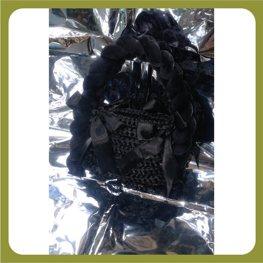 Handwoven Ribbon & Icelandic Wool Mini Bag - All-Black Exclusive Purse with Bow-Adorned Design