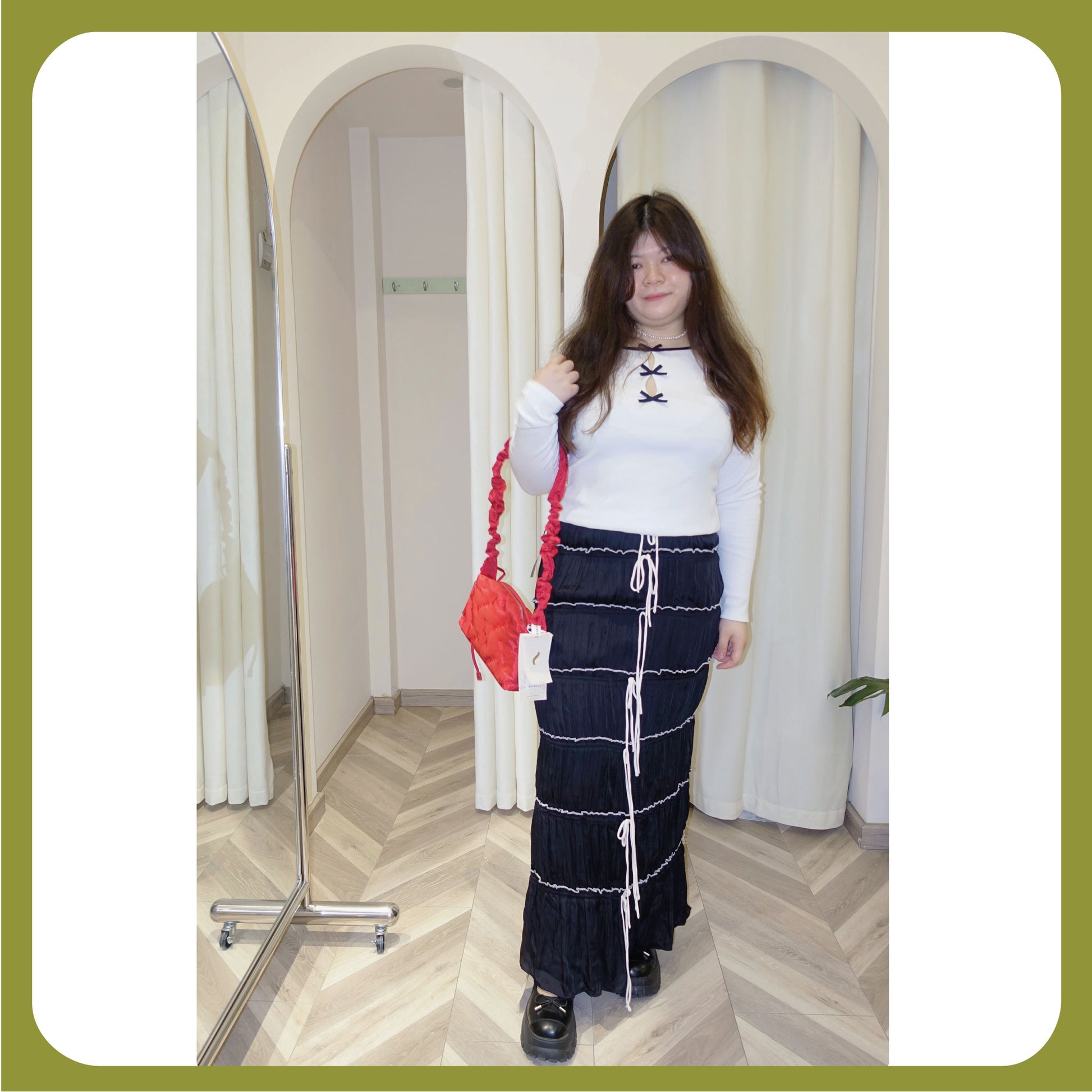 Made from a lightweight blend of 30% cotton, 10% nylon, and 60% polyester, this plus size maxi skirt features a unique crinkle texture with multiple tiered panels. Each tier is accented with delicate bow ties, creating a playful yet elegant look. The flowy silhouette and elastic waistband flatter curves comfortably, making it perfect for vacations, brunch, or chic casual days.
